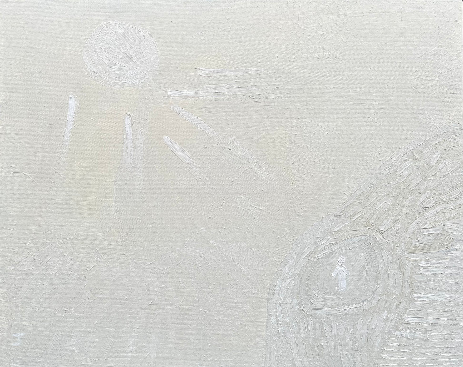 In this surreal landscape by J, a solitary figure stands bathed in the stark light of an overwhelming sun. The minimalist composition and muted tones emphasise the profound sense of isolation, as the vast emptiness of the surroundings mirrors the inner solitude of the figure. The piece invites the viewer to contemplate the experience of being alone in the world—whether in the physical or emotional sense—while the intense light suggests both exposure and enlightenment. This artwork serves as a poignant meditation on solitude, existence, and the quiet moments of introspection that shape our understanding of self.